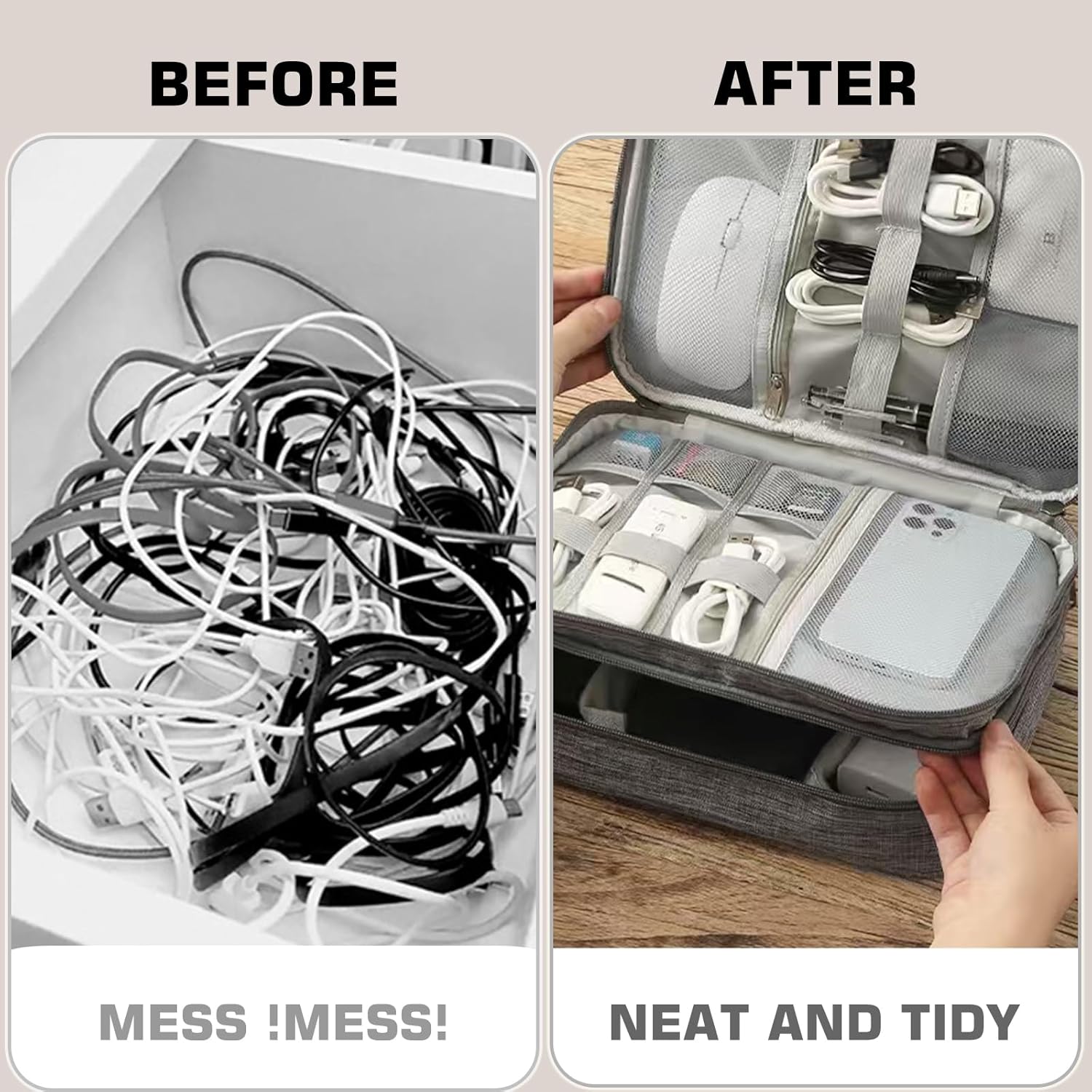 STORAGE CAPACITY: Accommodates various electronic accessories including power banks, adapters, cables, chargers, and earphones while maintaining a compact profile