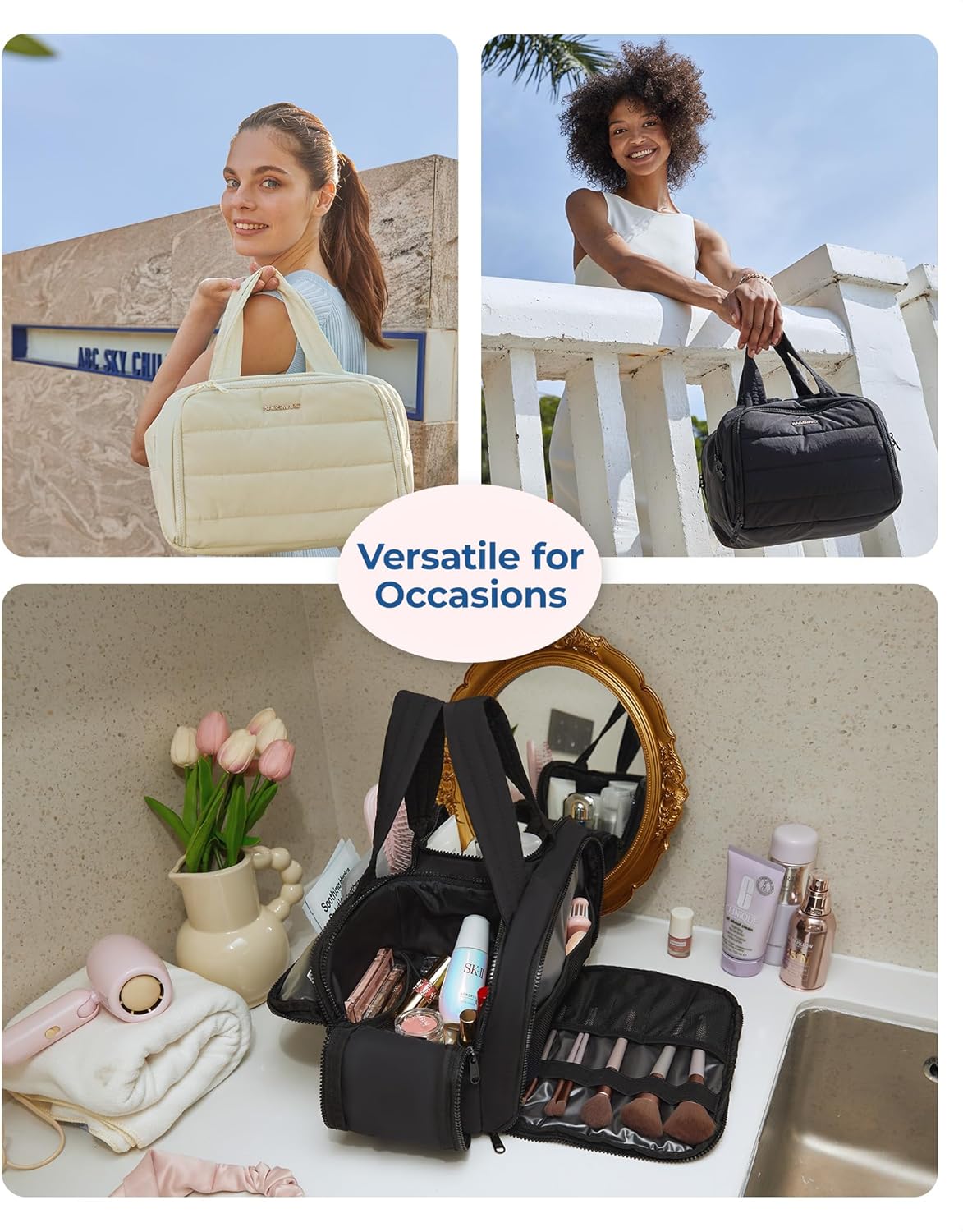 Easy Access and Keep Upright : Full opening and not piling up for easy access to items. Double side full open design of travel bag keeps cosmetic bottles and toiletries can stand upright in the middle compartment. Avoid leakage during transit