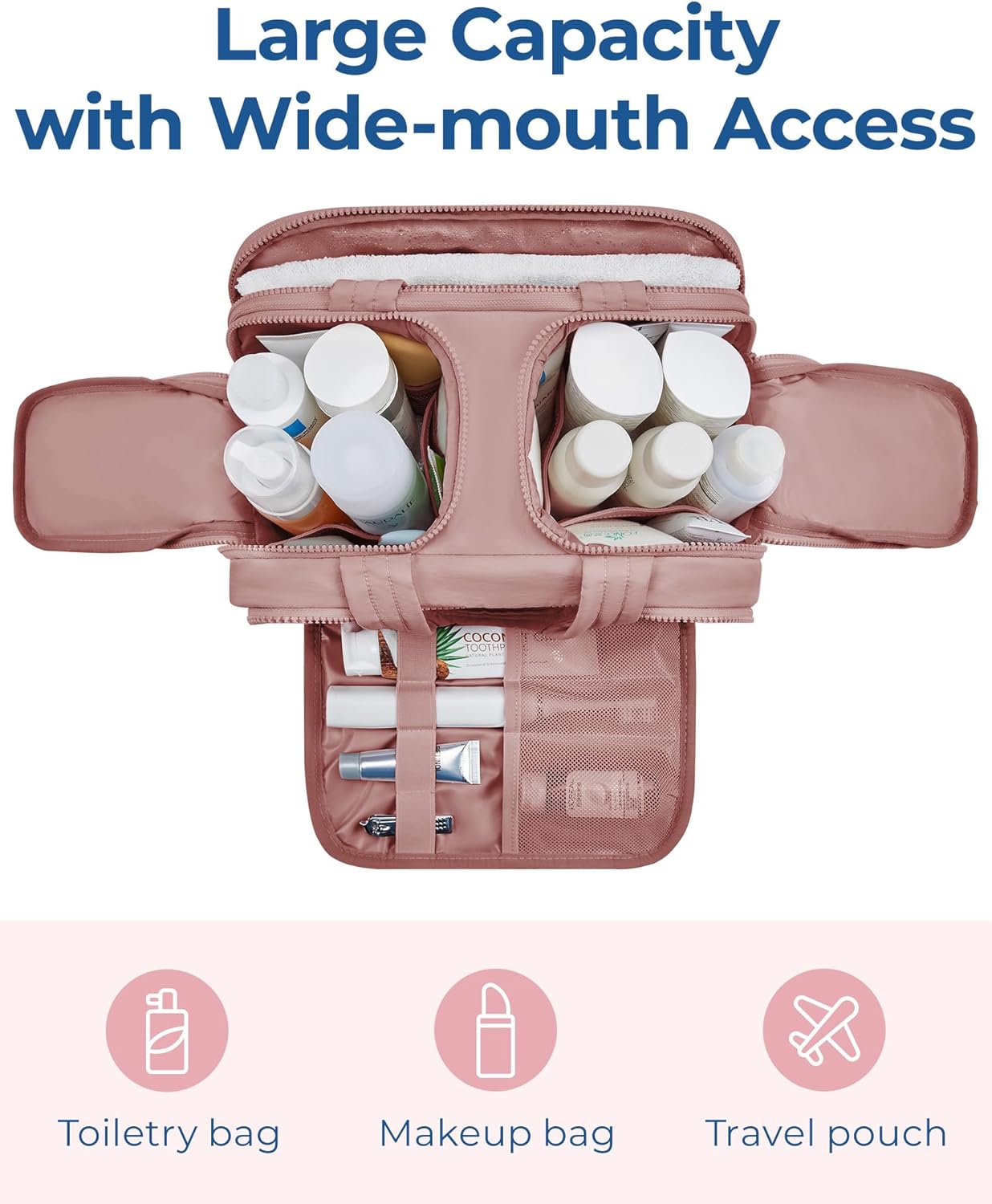 Easy Access and Keep Upright : Full opening and not piling up for easy access to items. Double side full open design of travel bag keeps cosmetic bottles and toiletries can stand upright in the middle compartment. Avoid leakage during transit