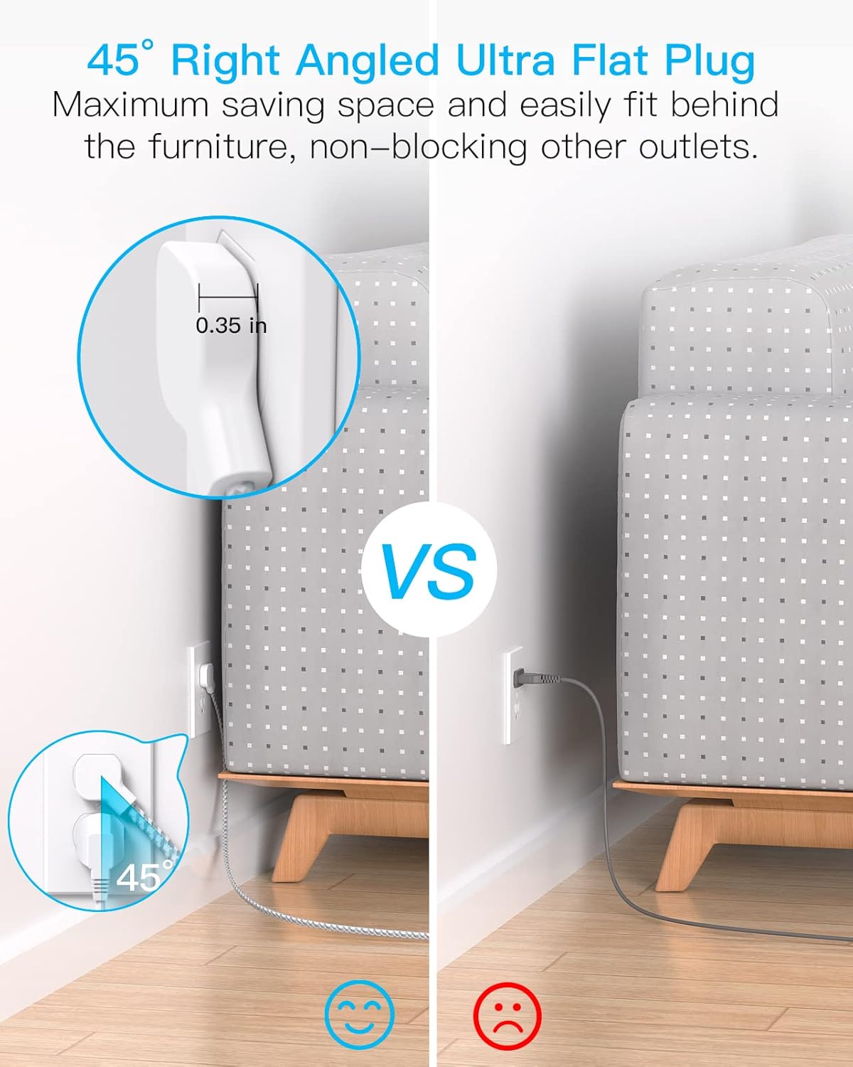 【Right Angle Ultra Flat Plug & 5 Ft Braided Extension Cord】 – With only 0.35 inch ultra thin plug and 45 degree right angle design, which is much slimmer than traditional plugs, can close to the wall easily and hide in the back of furniture, no waste for outlet and space. 3mm thicker extension cord is made of pure copper, which has better current carrying capacity (15A). The braided power cord is not easy to deform, durable and more safety.