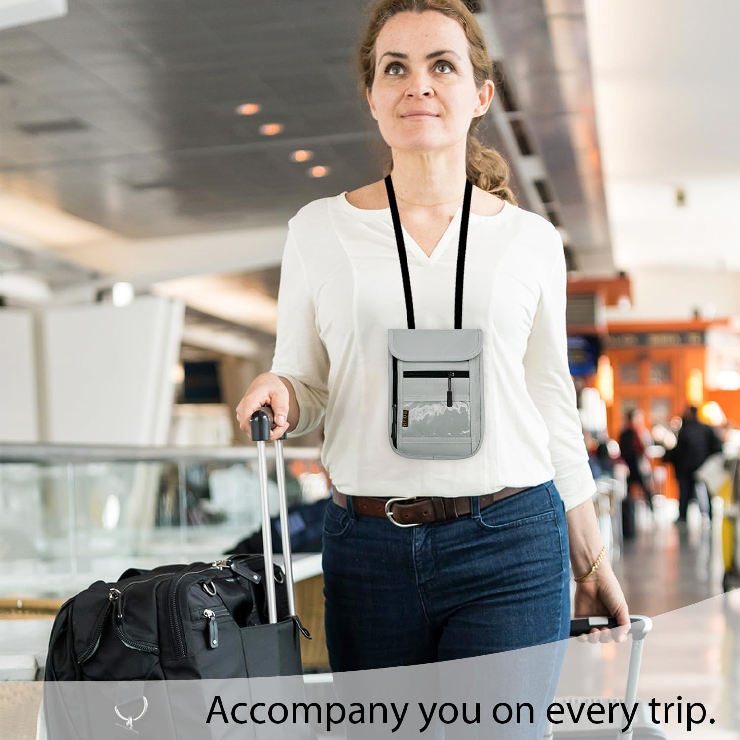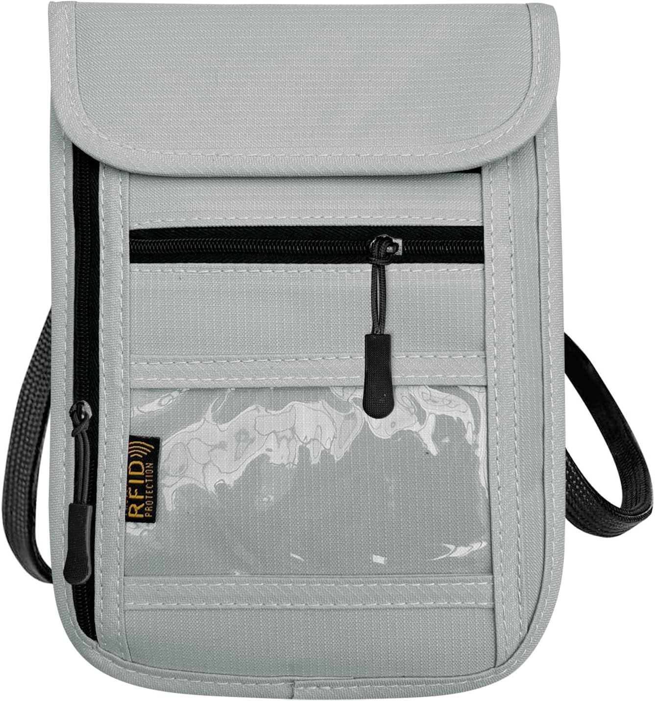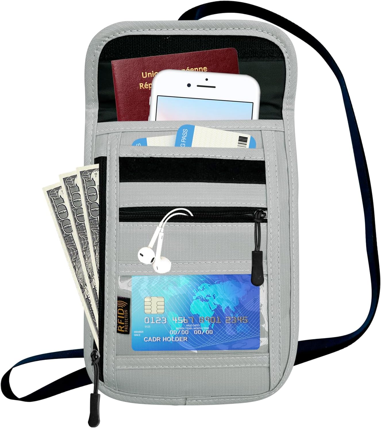 FLEXIBLE STORAGE:This Travel Wallet features FIVE SMART STORAGE COMPARTMENTS to easily organize your documentation and valuables , including two zippered pockets, one closure patch , and an ID window for boarding passes allowing easier security checks .The Travel Pouch comes with adjustable hook, strap and loop fastener